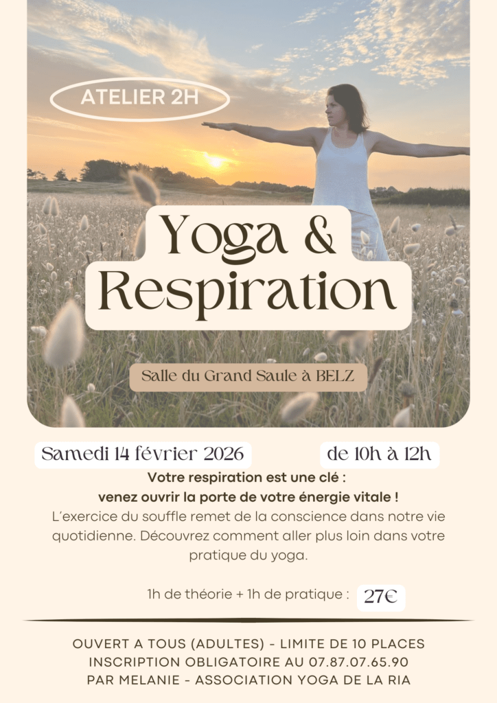 Le samedi 14 février 2026, à Belz (56550), j’anime un atelier Yoga & Respiration de 2 heures, ouvert à toutes et tous, au sein de la Salle du Grand Saule.